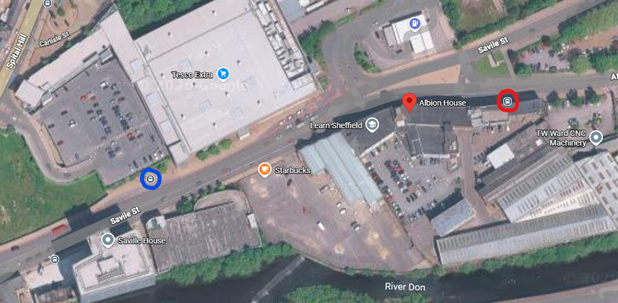From Sheffield City Centre towards Albion House, stops outside Tesco (~150 meters to left of entrance, marked blue)