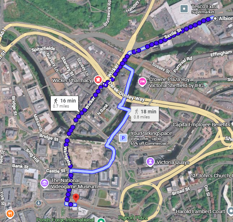 - (1) Tesco Extra, 1 Savile St, S4 7UD (<2 min walk) There will be parking restrictions here, please ensure you pay attention to signs within the car park